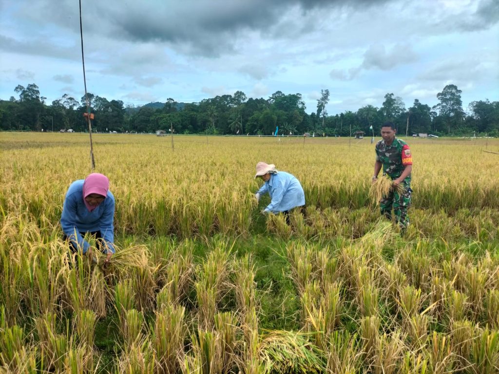 Beranda ยป Sukseskan Ketahanan Pangan, Babinsa Koramil 04/Pinangsori Bantu Petani Panen Padi