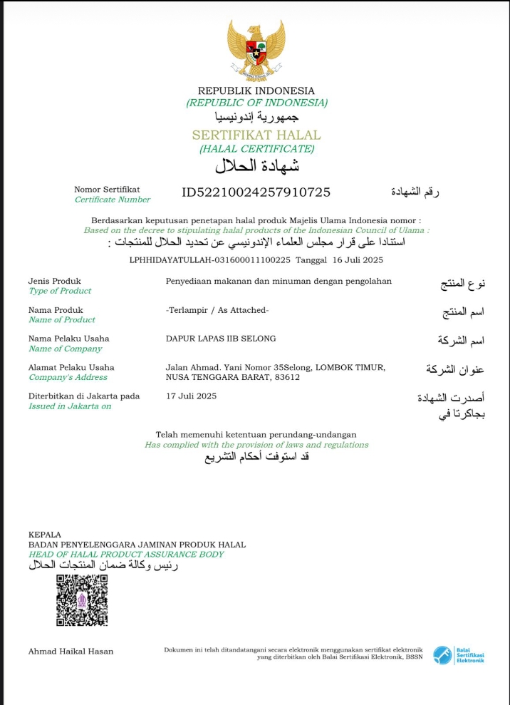 Beranda » Dapur Lapas Selong Raih Sertifikat Halal, Jamin Makanan Sehat dan Aman untuk Warga Binaan