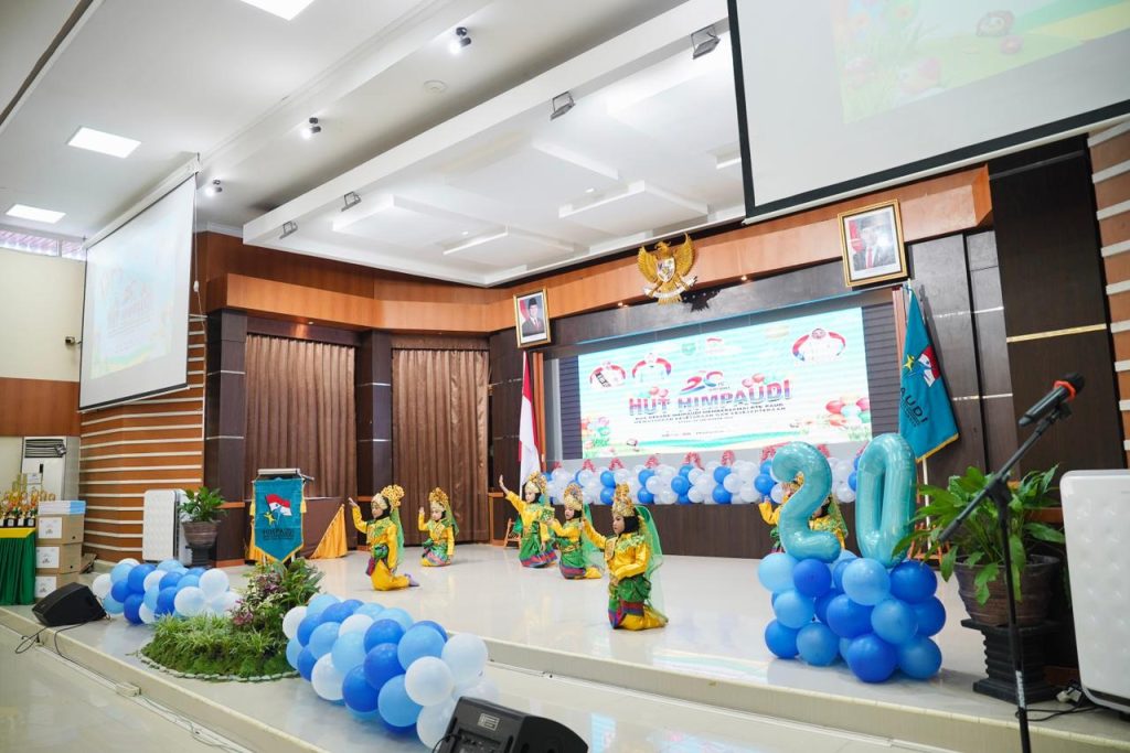 Dengan mengusung tema “Dua dekade Himpaudi membersamai PTK PAUD mewujudkan kesetaraan dan kesejahteraan,” peringatan ini berlangsung meriah, ditandai pemotongan tumpeng dan beragam penampilan seni budaya dari anak-anak didik.