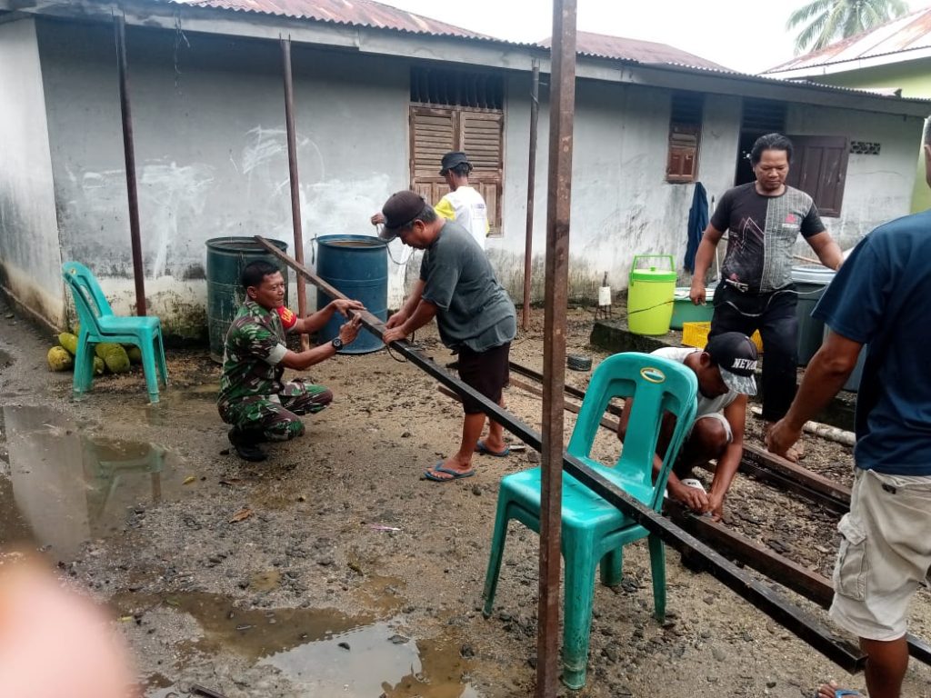 Babinsa Koramil 04/Pinansori, Serka Mugi melaksanakan komunikasi sosial( gotong royong) membantu warga memasang tenda dapur hajatan/pesta di lingk IX, Kelurahan Pinangsori.