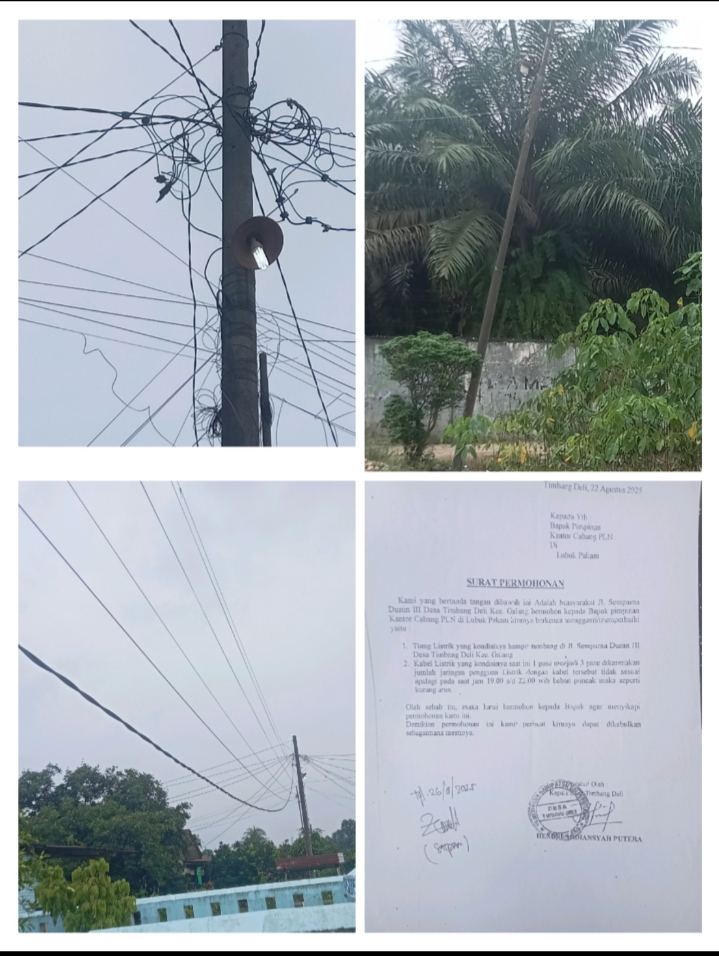 Deli Serdang – Warga Dusun III Desa Timbang Deli, Kecamatan Galang, Kabupaten Deli Serdang, kembali menyuarakan keresahan mereka terhadap kondisi jaringan listrik PLN yang dinilai membahayakan keselamatan masyarakat. Kabel listrik terlihat menjuntai rendah hingga mendekati tanah, sementara salah satu tiang listrik di wilayah tersebut dilaporkan dalam kondisi miring dan terancam tumbang.