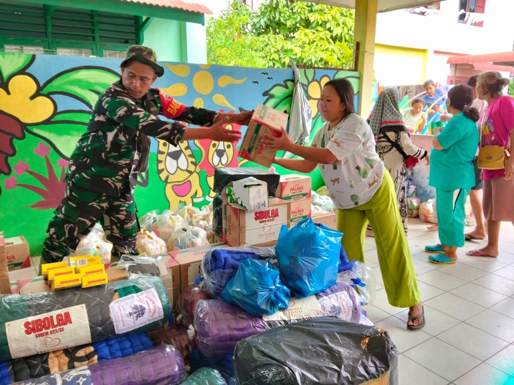 Sibolga-Babinsa Koramil 06/Kota Sibolga,Serda Candra Ginting , melaksanakan kegiatan pendampingan penyaluran bantuan sembako kepada warga terdampak bencana alam di Kelurahan Huta Tonga-tonga, Kecamatan Sibolga Utara, Minggu (21/11/2025).