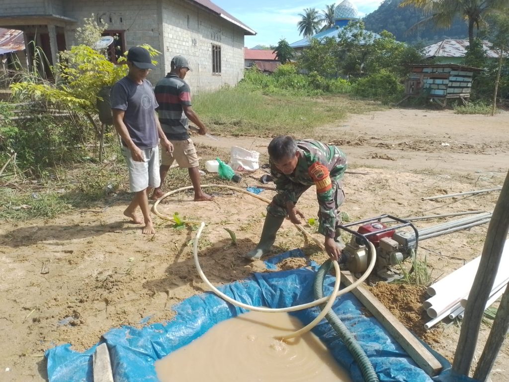 Tapteng-Babinsa Koramil 03/Pandan, Sertu Sochi Hulu, bersama masyarakat melaksanakan pembuatan sumur bor Bantuan Dari KASAD Jenderal TNI Maruli Simanjuntak,guna memenuhi kebutuhan air bersih bagi warga terdampak banjir di Kel.Lubuk Tukko Kec.Pandan Kab.Tapanuli Tengah, Senin (22/12/2025).