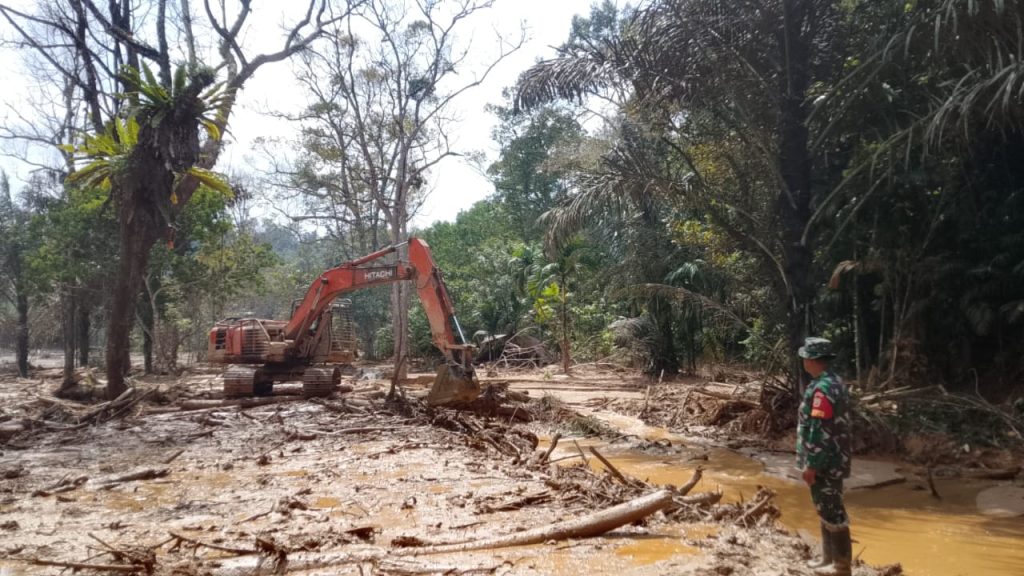 Pembersihan jalan dilakukan menggunakan alat berat berupa excavator untuk mengangkat material lumpur, batu, dan kayu yang menutupi badan jalan akibat terjangan banjir. Kegiatan tersebut dipusatkan di Ling.IV,Kel