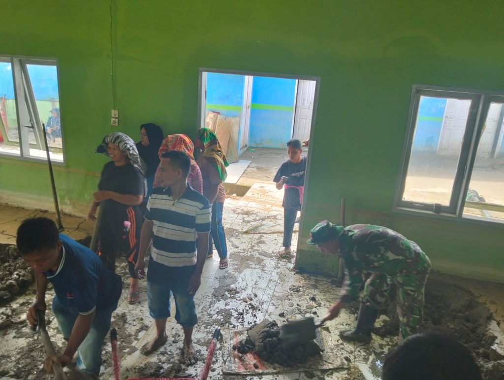 Bersama dengan seluruh aparat desa Se kecamatan dan masyarakat binaan dengan penuh semangat membersihkan lumpur dan kotoran yang ada di sekitaran halaman dan jalan Kantor Camat dan sekolah ,meskipun kondisi masi dalam proses pemulihan pasca banjir, bersama sama kerja keras Babinsa memberikan harapan semangat baru bagi warganya.selain melakukan kegiatan pembersihan Babinsa juga memberikan himbawan. kepada warga sekitar mengingatkan mereka untuk tetap waspada terhadap potensi bencana alam seperti banjir dan longsor,Himbawan tersebut di sertai dengan ajakan untuk tetap menjaga budaya gotong royong dan saling membantu satu sama lain dalam menghadapi cobaan…