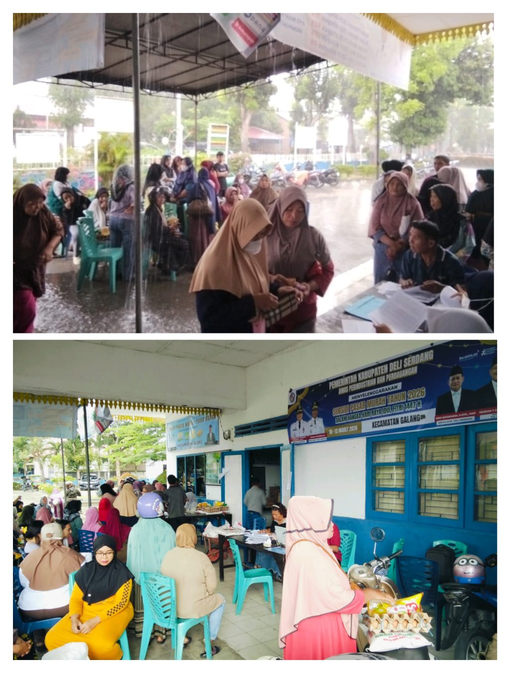Galang, Deli Serdang — Meski diguyur hujan, semangat warga kurang mampu untuk mendapatkan kebutuhan pokok dengan harga terjangkau tetap tinggi pada kegiatan pasar murah yang digelar di Kantor Kecamatan Galang, Kabupaten Deli Serdang, Sabtu (14/03/2026).