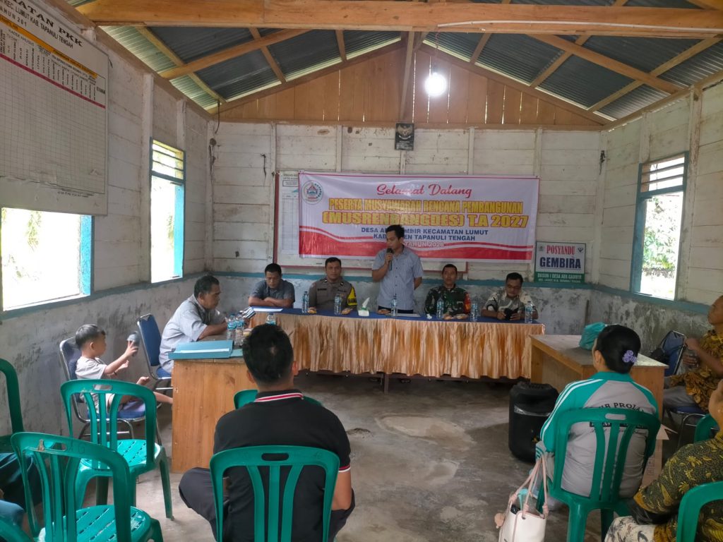 Tapteng-Dalam Rangka mendukung program pembangunan di desa binaan,Babinsa Koramil 04/Pinangsori Kodim 0211/TT Serda Sembiring menghadiri kegiatan Musyawarah Perencanaan Pembangunan (Musrenbang) Desa bertempat di Balai Desa Aek Gambir Kecamatan Lumut Kabupaten Tapanuli Tengah.