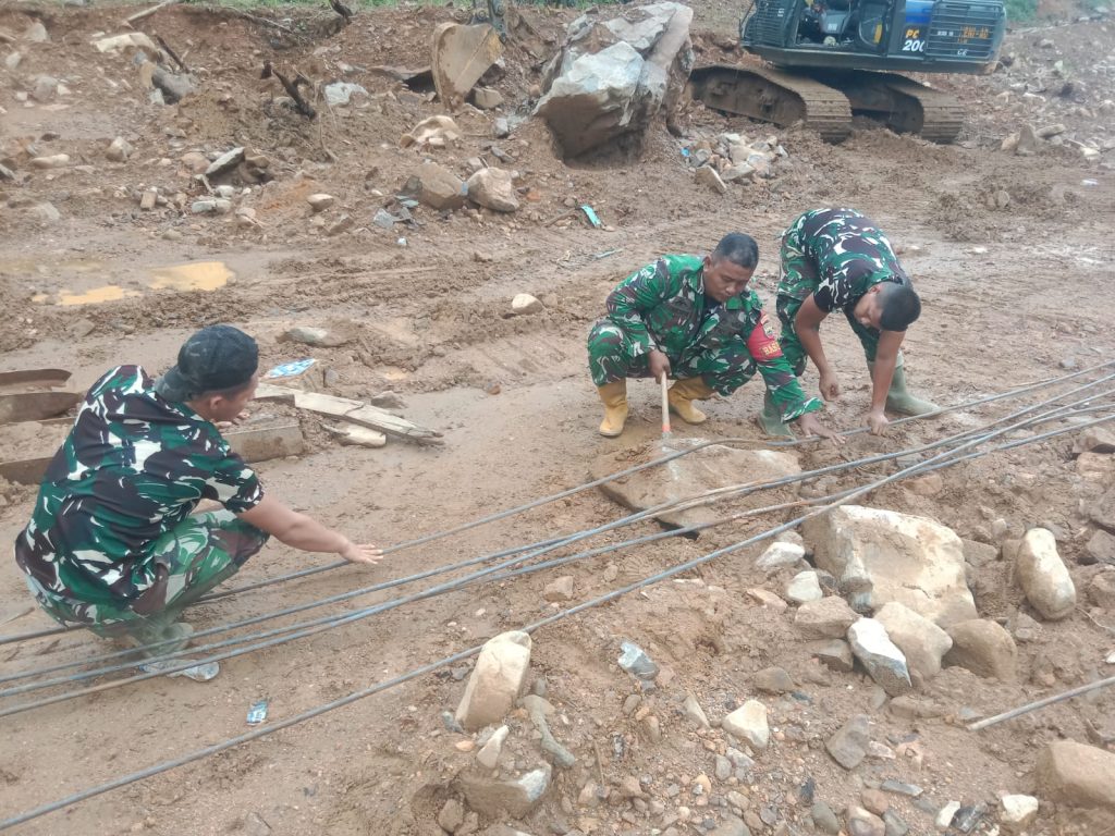 Beranda » Babinsa Koramil 05/Kolang Bersama Personil Batalyon TP 908/Gaja Dompa Membangun Jembatan Aramco Yang Hancur Akibat Banjir Bandang