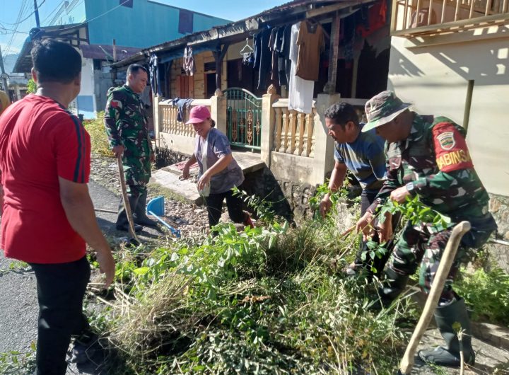 Tapteng-Babinsa Koramil 01/Barus Sertu Jhonathan Bagariang bersama aparatur Desa Kampung Mudik melaksanakan kegiatan gotong royong membersihkan saluran...