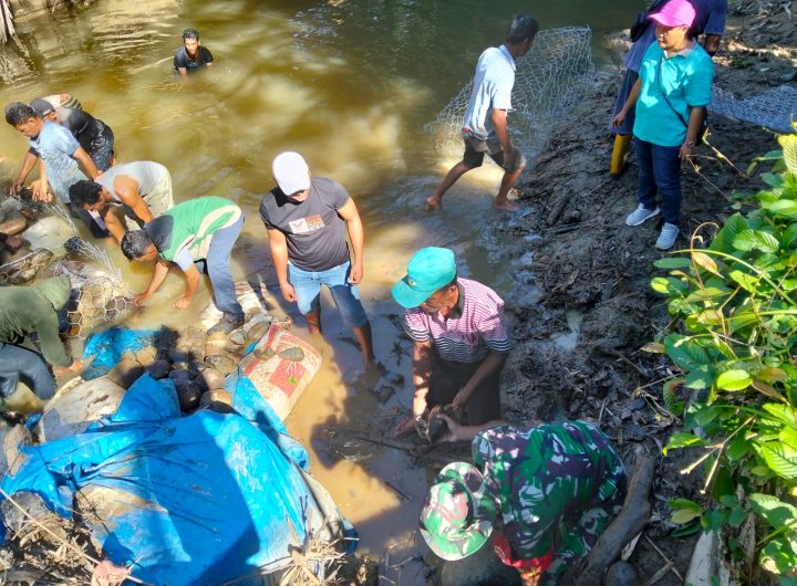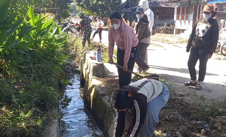 Tapteng-Babinsa Koramil 01/Barus Sertu Jhonathan Bagariang bersama aparatur Desa Kampung Mudik melaksanakan kegiatan gotong royong membersihkan saluran...