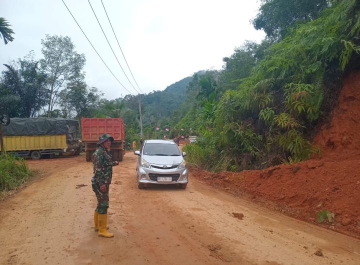 TAPTENG_ Babinsa Koramil 05/Kolang, Serka Alfons Manurung melaksanakan kegiatan monitoring jalan longsor dan amblas di Desa Mardame...