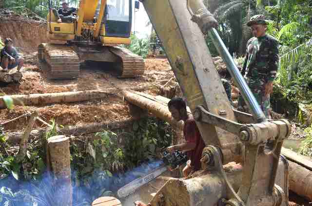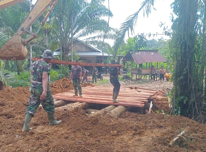 Tapteng-Anggota Satgas TMMD Kodim 0211/Tapteng bersama warga bahu-membahu membangun jembatan penghubung di atas sungai menggunakan batang kayu...