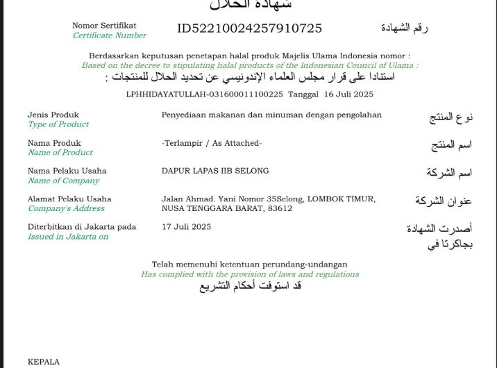 Lapas Selong-Info_PAS – Dapur Lembaga Pemasyarakatan Kelas IIB Selong resmi memperoleh Sertifikat Halal dari Badan Penyelenggara Jaminan...